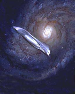 This illustration shows an advanced starship passing some tens of thousands of light years above the core of a galaxy that might be our own. It was created in Photoshop, using a Hubble Space Telescope photo of the galaxy M-33 as a backdrop.