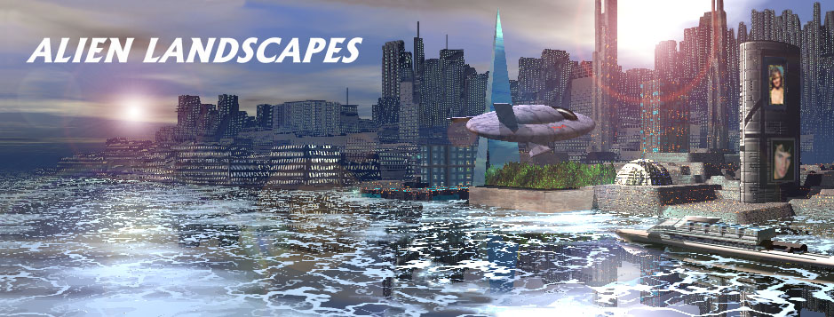 The scene at left was one of my early attempts in Bryce2, a fairly simple view of an alien base or city on an alien seacoast. Bryce has been a major aid in helping me visualize other-worldly environments for my writing.