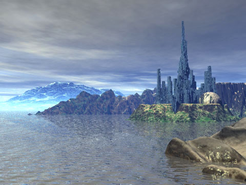 Rendered in Bryce2, with touch-up and details in Photoshop.