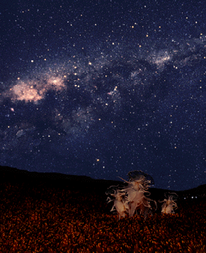 Shown are friends of mine, R'schevr'gha't and his two budlings, on their homeworld of Llweysht'ghvre, a world some fifteen thousand light years closer to the Galaxy's core than our sun. The Gh'veye of Llweysht'ghvre have little in common with Humankind physically, but they do share with us our intelligence, our ability to reason ... and our capacity for wonder.